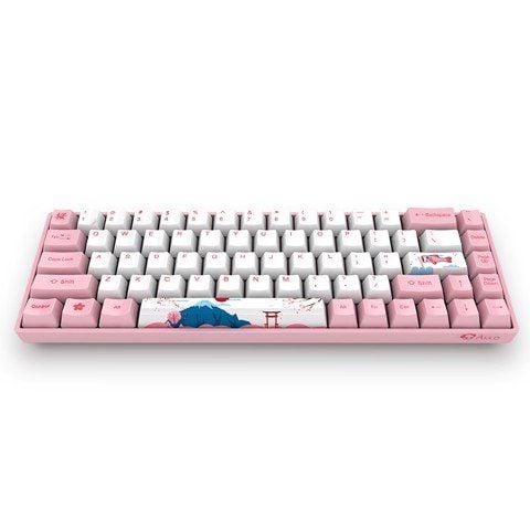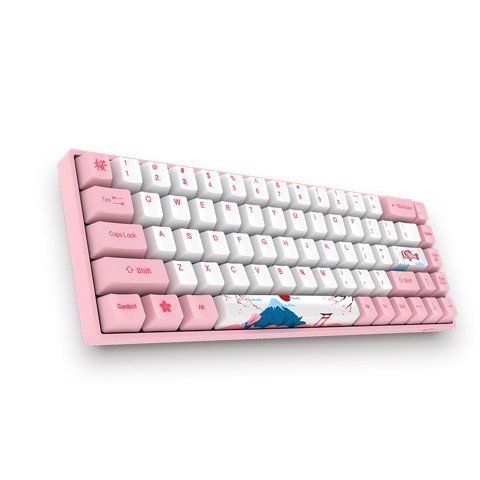 Bàn phím cơ AKKO 3068 World Tour Tokyo (Akko switch) với phần Keycap custom lấy chủ đạo là màu hoa anh đào, núi Phú sĩ, cá chép và mèo may mắn (biểu tượng của Nhật Bản). Đây được xem là một trong những sự lựa chọn hàng đầu dành cho một trong những mẫu bàn phím máy tính nhỏ gọn, cùng với tông màu nổi bật.