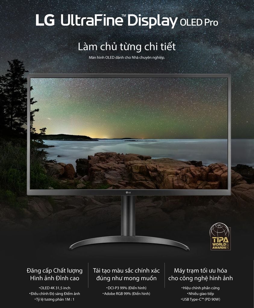 Các điểm ảnh tự chiếu sáng của LG UltraFine™ OLED Pro cho phép hiển thị hình ảnh cực kỳ chính xác. Công nghệ Điều chỉnh Độ sáng Điểm ảnh điều chỉnh các điểm ảnh riêng lẻ để thể hiện độ tương phản hoàn hảo.