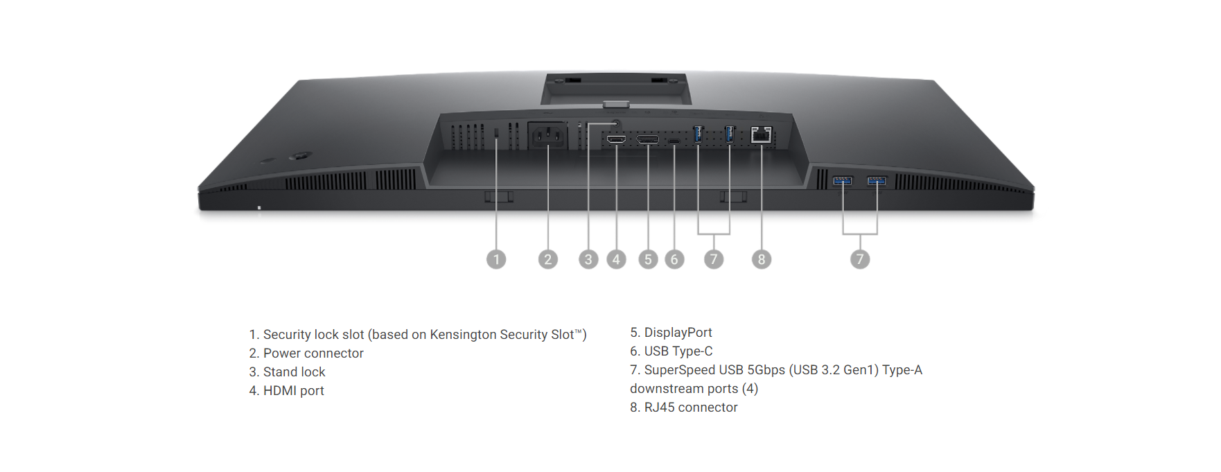 - HDMI (HDCP 2.3) - DisplayPort 1.4 (HDCP 2.3) - USB-C 3.2 Gen 1 upstream (power up to 90W) - 4 x USB 3.2 Gen 1 downstream - LAN (RJ-45)